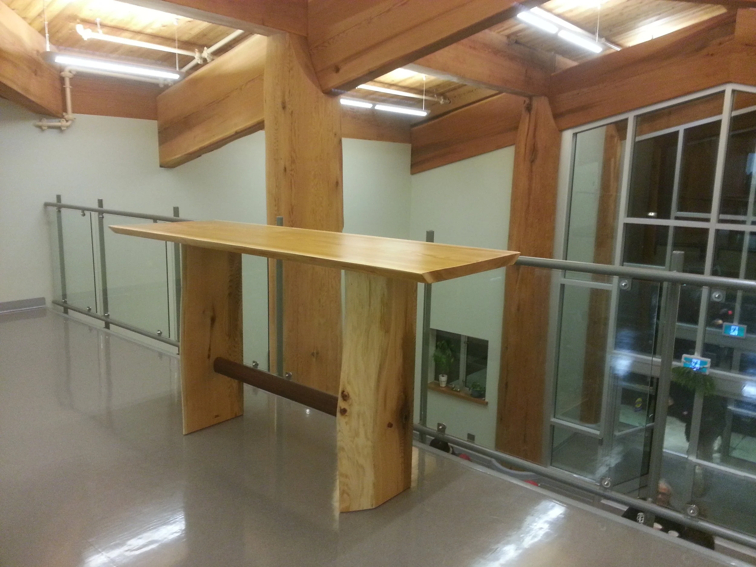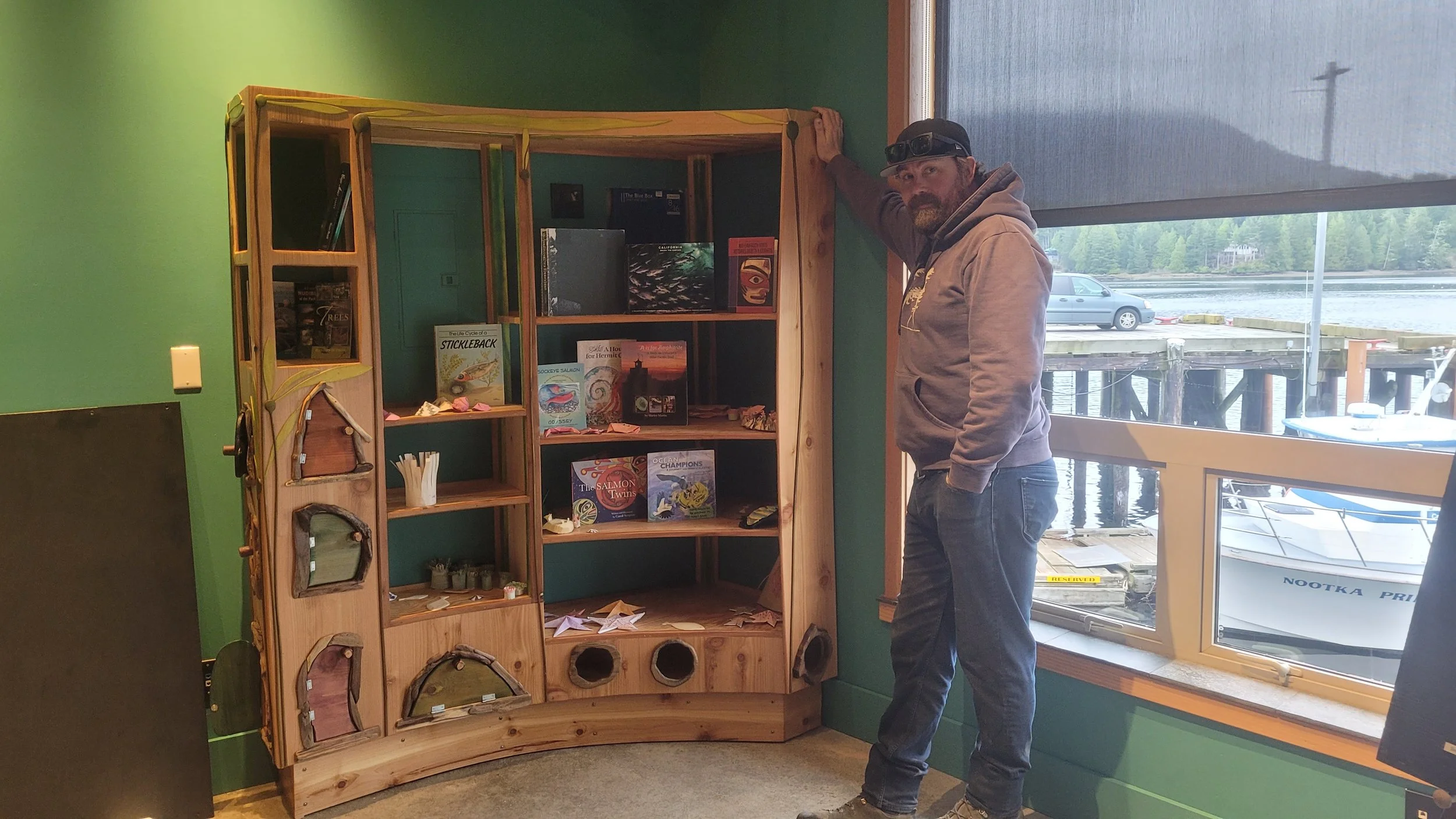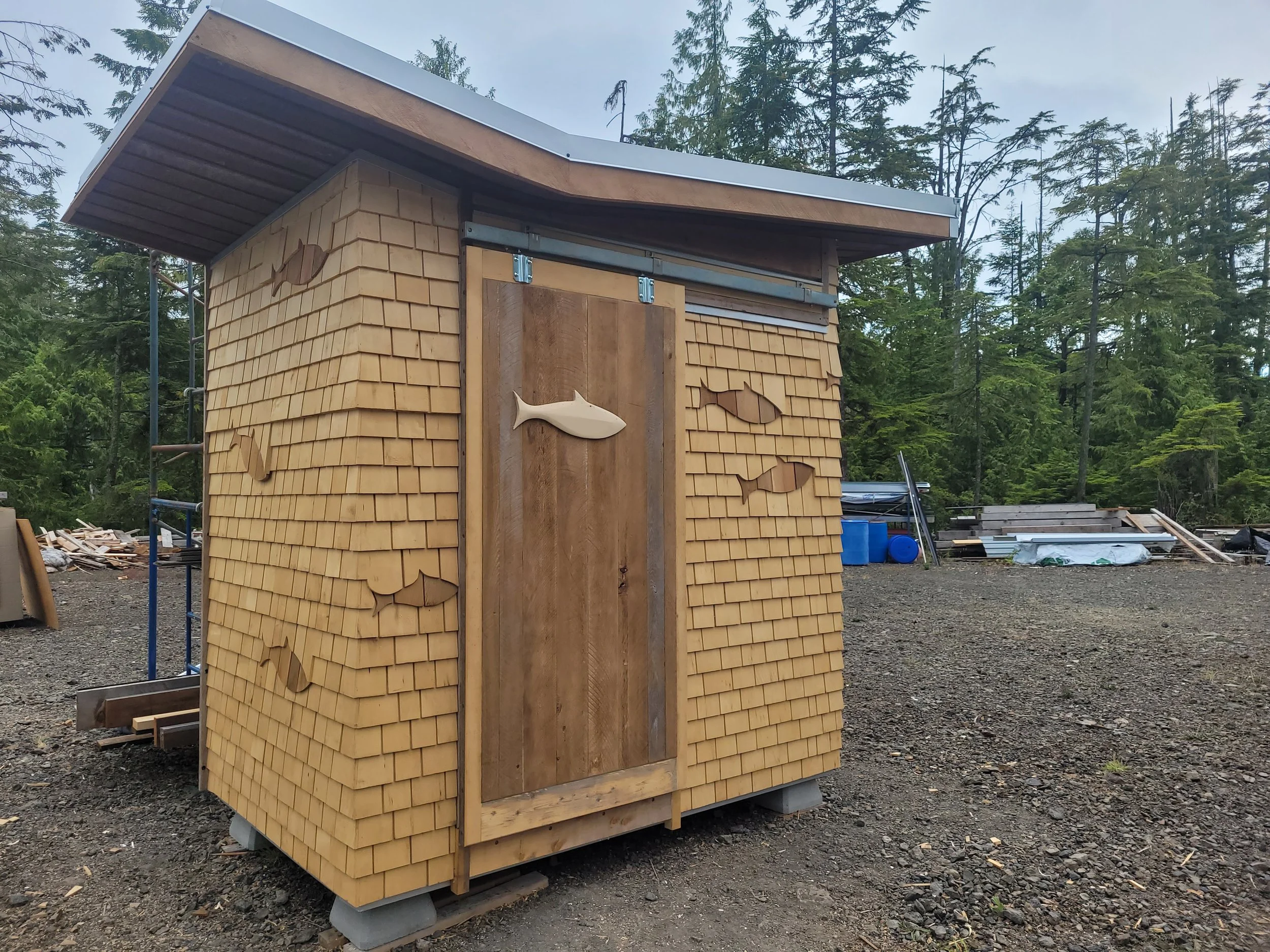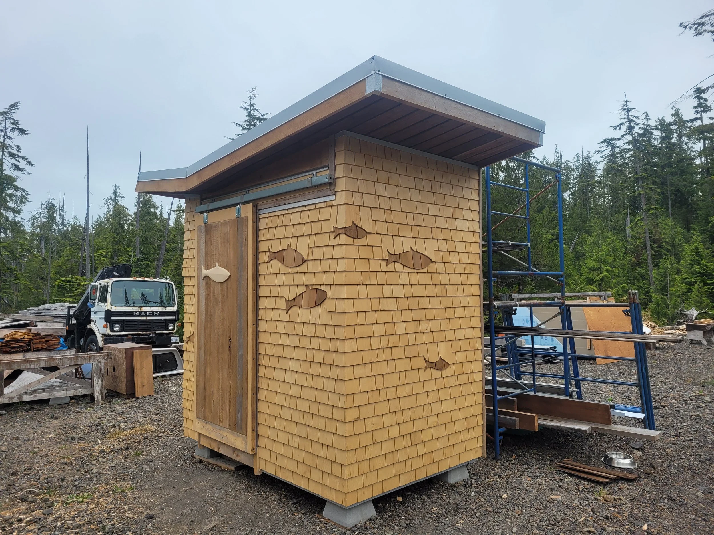 The main building is a work of art itself- designed by Blue Sky Architecture and many-a-carpenter have contributed to the interior finishing over the years. We had a very cool art installation of a yellow cedar fish on the front of the building, a storage shed, kids library, benches, etc…which are perhaps some of the most fun kind of building a carpenter could hope for.
