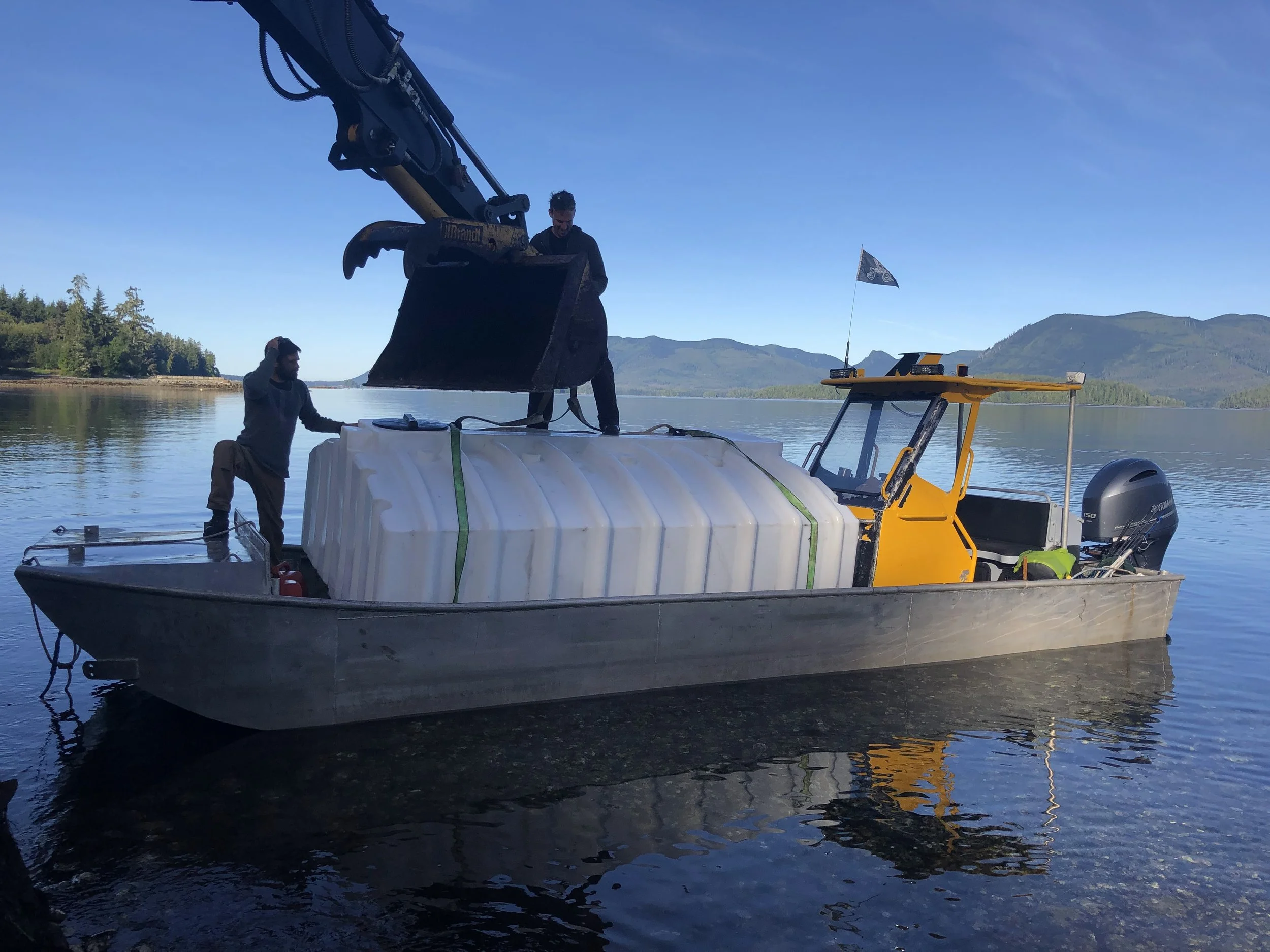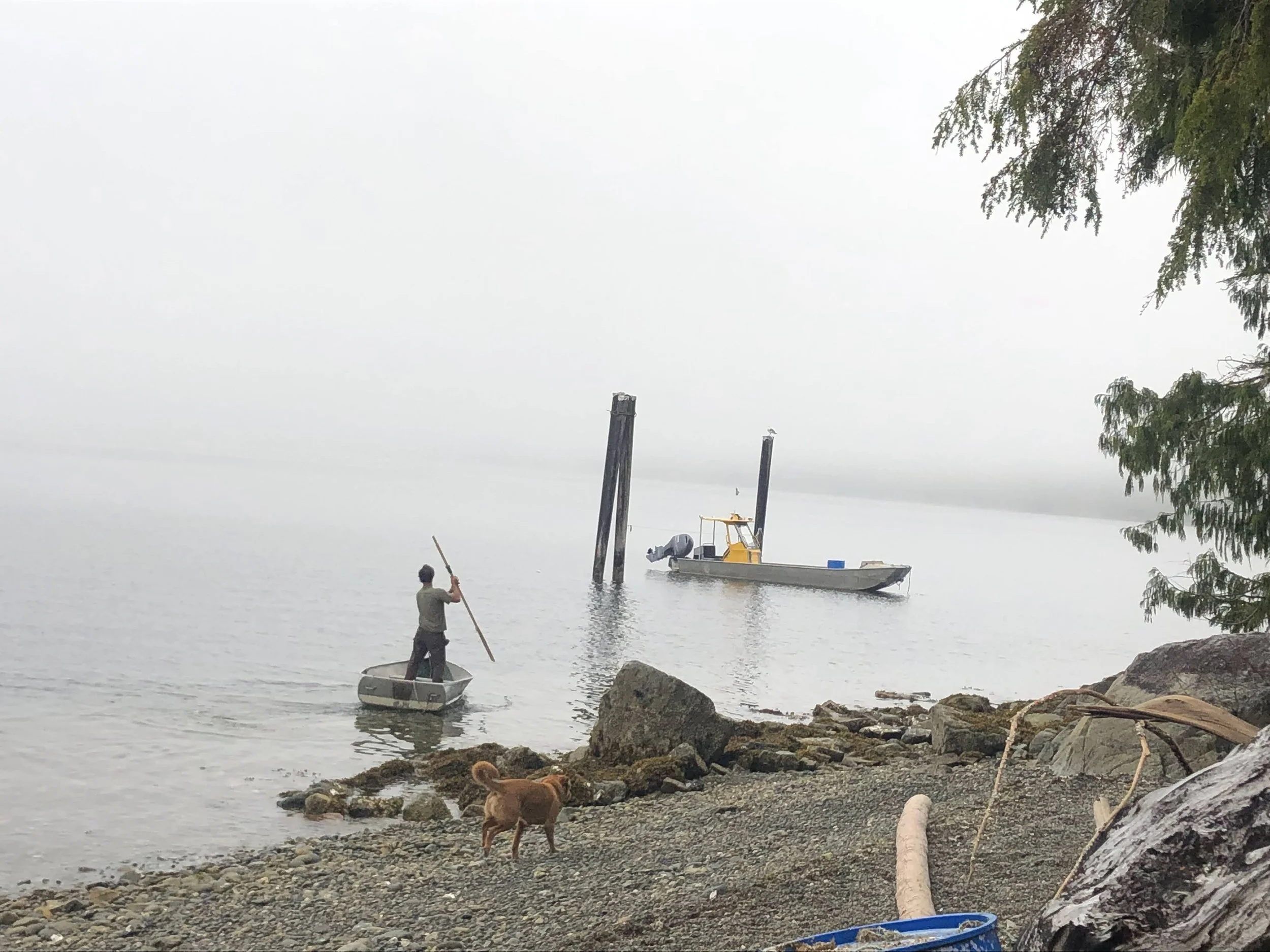 Using our 26’ re-designed Herring Skiff we travelled from Ucluelet to a remote location to assist in the raising of a pre-built Timberframe. A barge full of building components arrived which was followed up with us, on our daily commute, bringing in tanks, windows, siding packages etc…just getting there was most of the adventure.