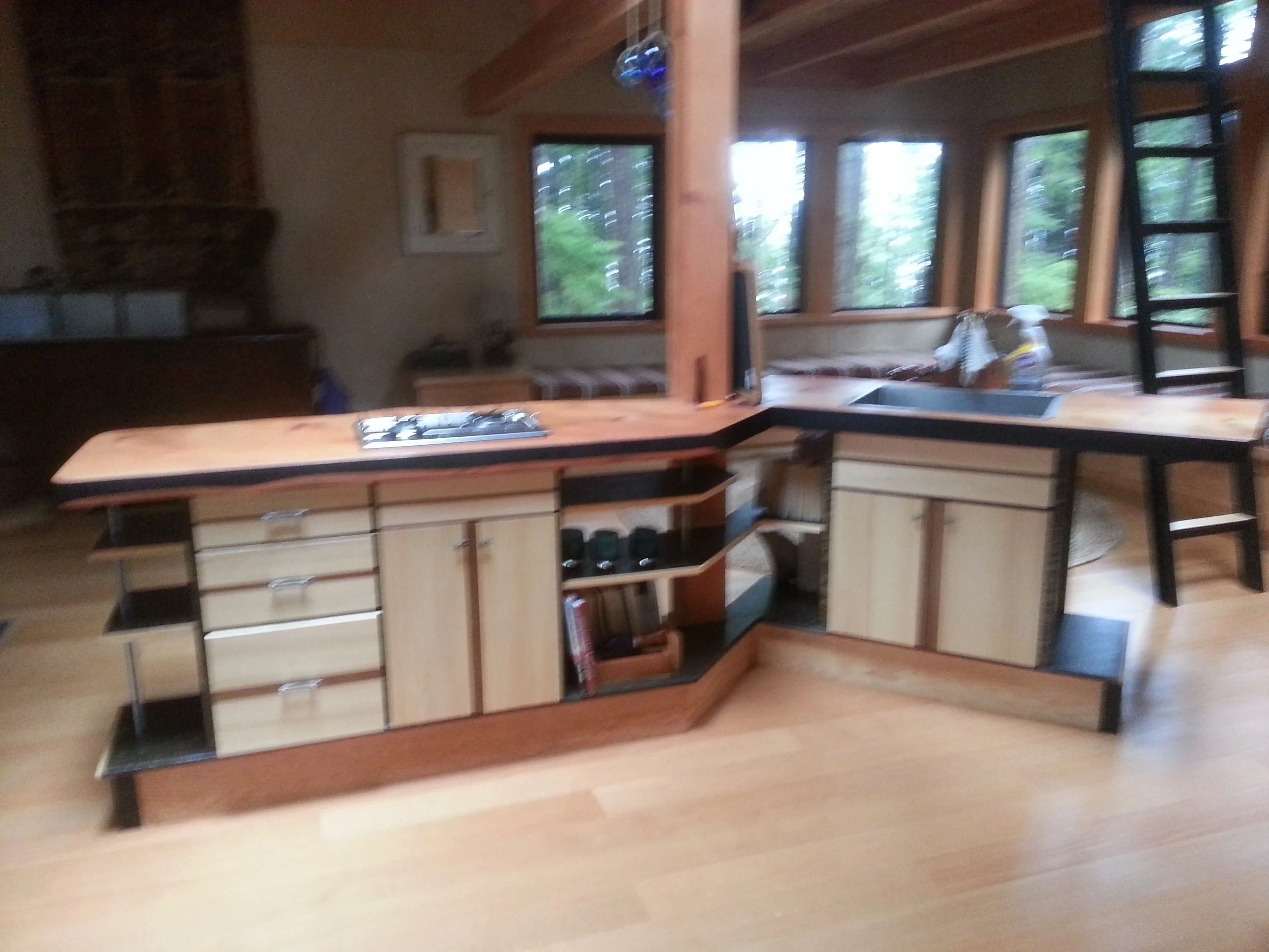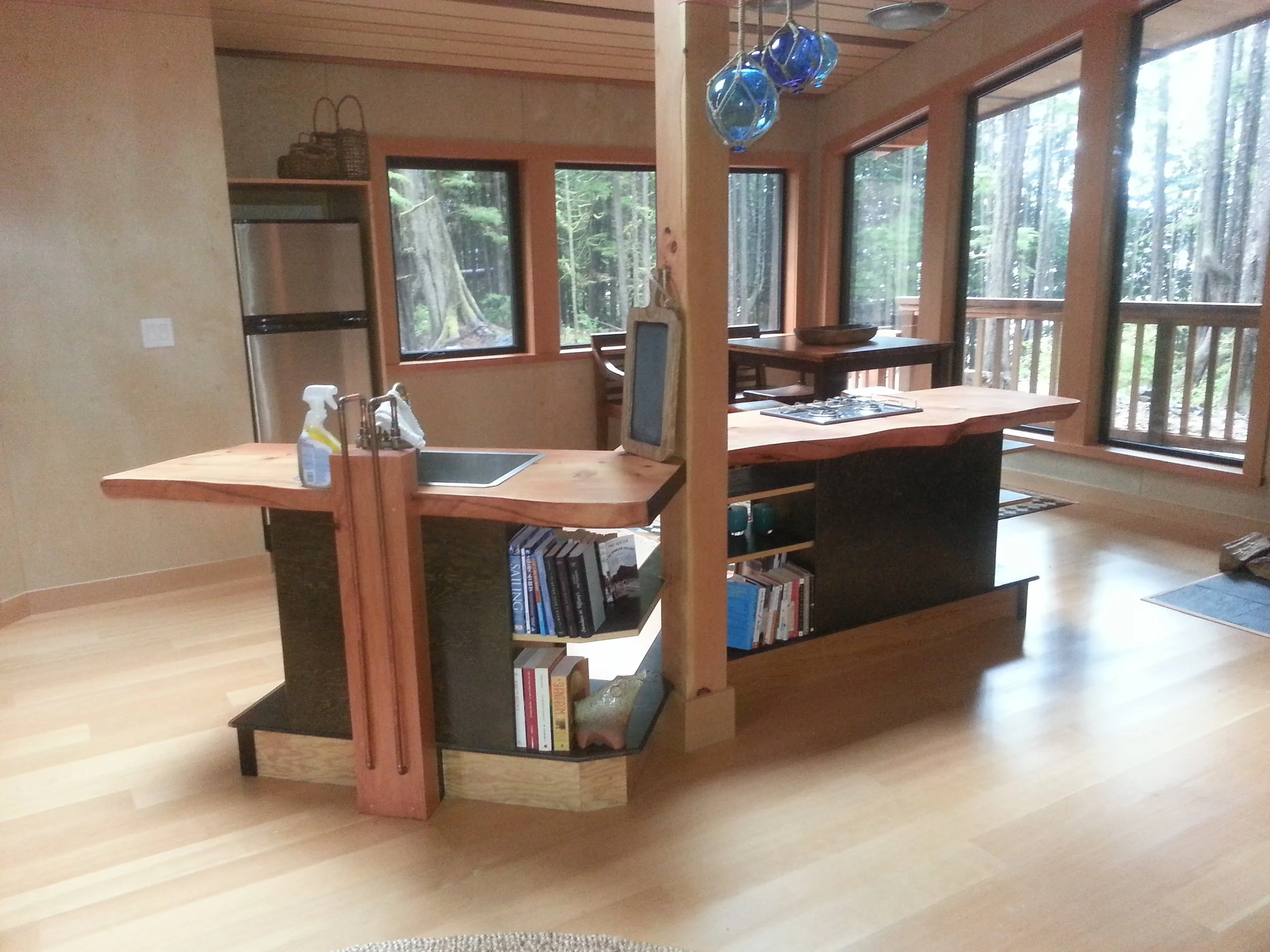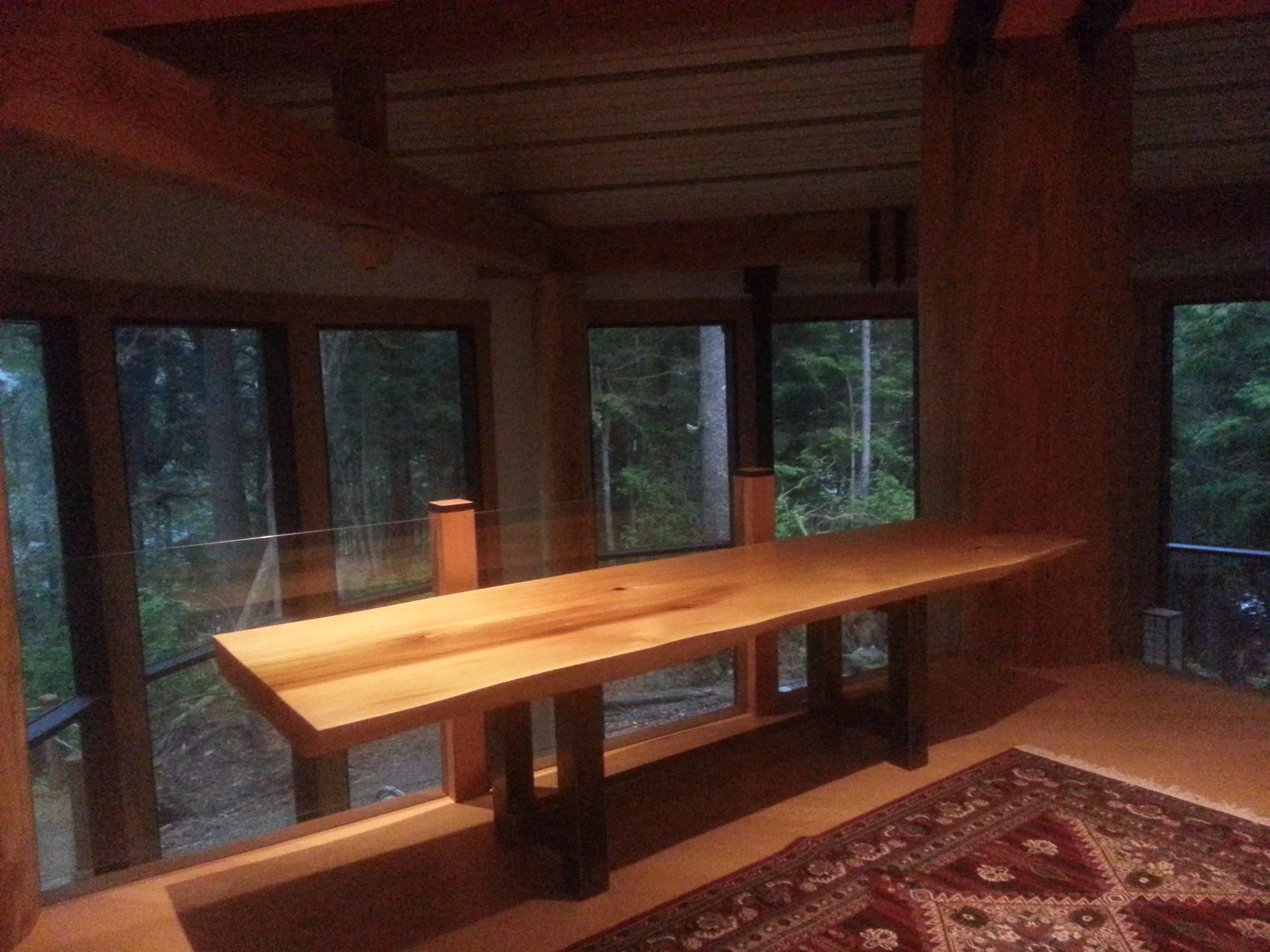 Collaborating with Ian Garrard,in Ucluelet,we built most of this project in Tidewaters local Ucluelet shop. This project was extremely interesting. Designed by local builder/designer, Leif Hagar and collaborated with many a craftsman, at its heart is the Great Room- a huge round living room, accented by an incredible roof lines and interior finishing. Being on an island the access was part of the adventure. Barges full of heavy machinery and supplies, had to be timed with the tides to move everything on and off again.