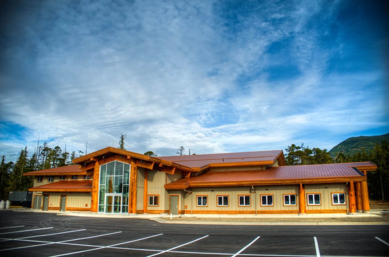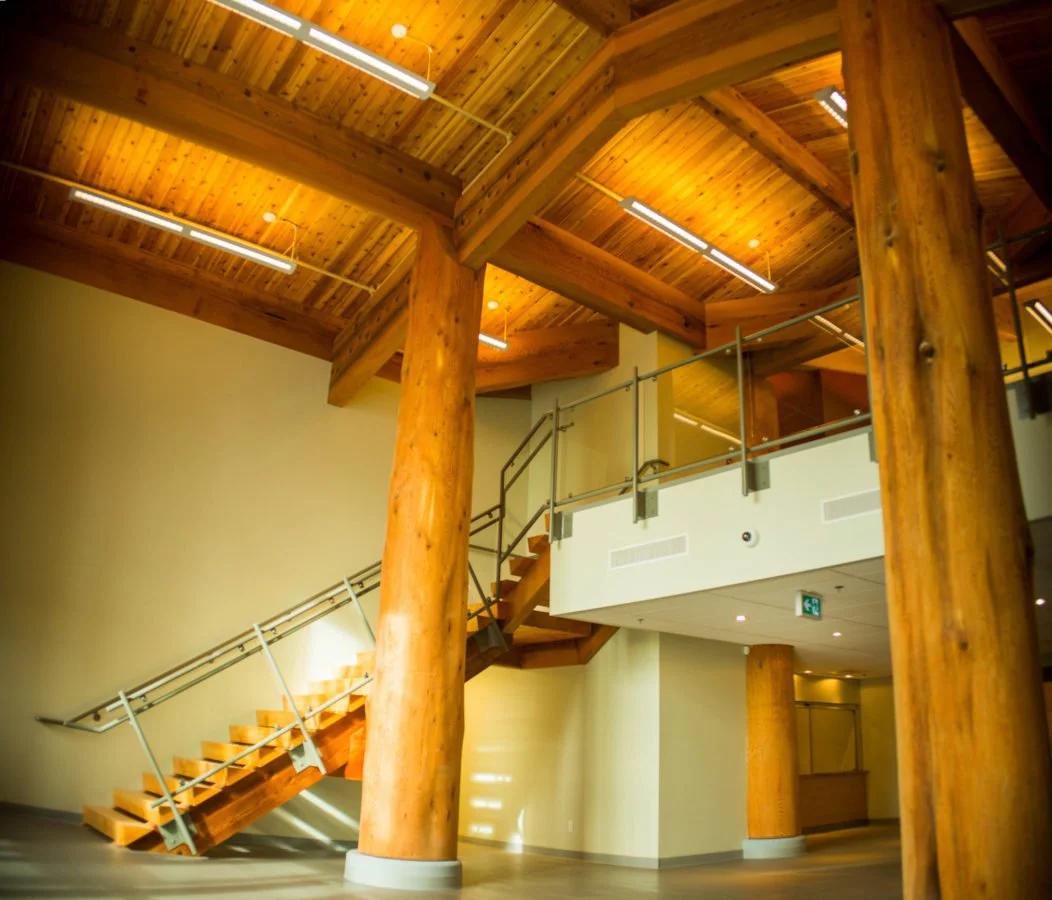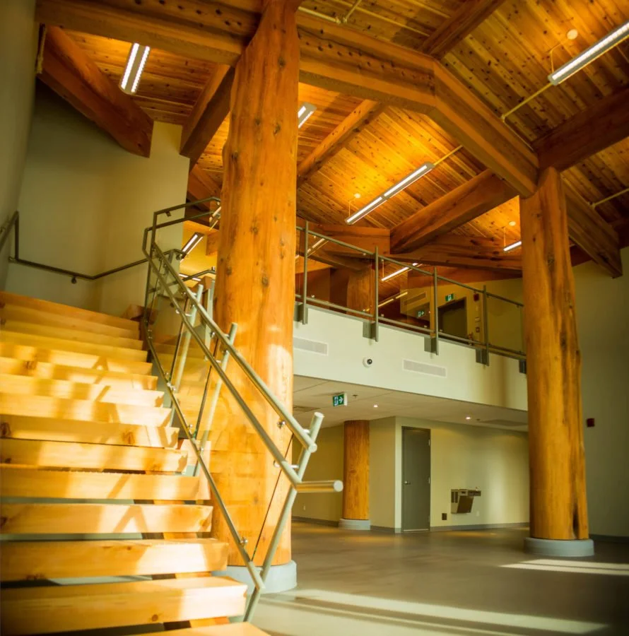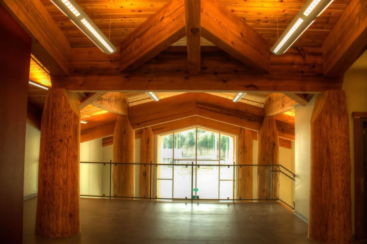 Working with Architect Scott Peck and Sean Clayton of Humphrey Construction, we built a portion of this incredible project. Ian Garrard showed his years of experience working on the log rounds which mixed with the huge horizontal timbers was designed to look somewhat like a traditional long house. This building houses a basketball court, a daycare, offices and a huge commercial kitchen. A true community centre.