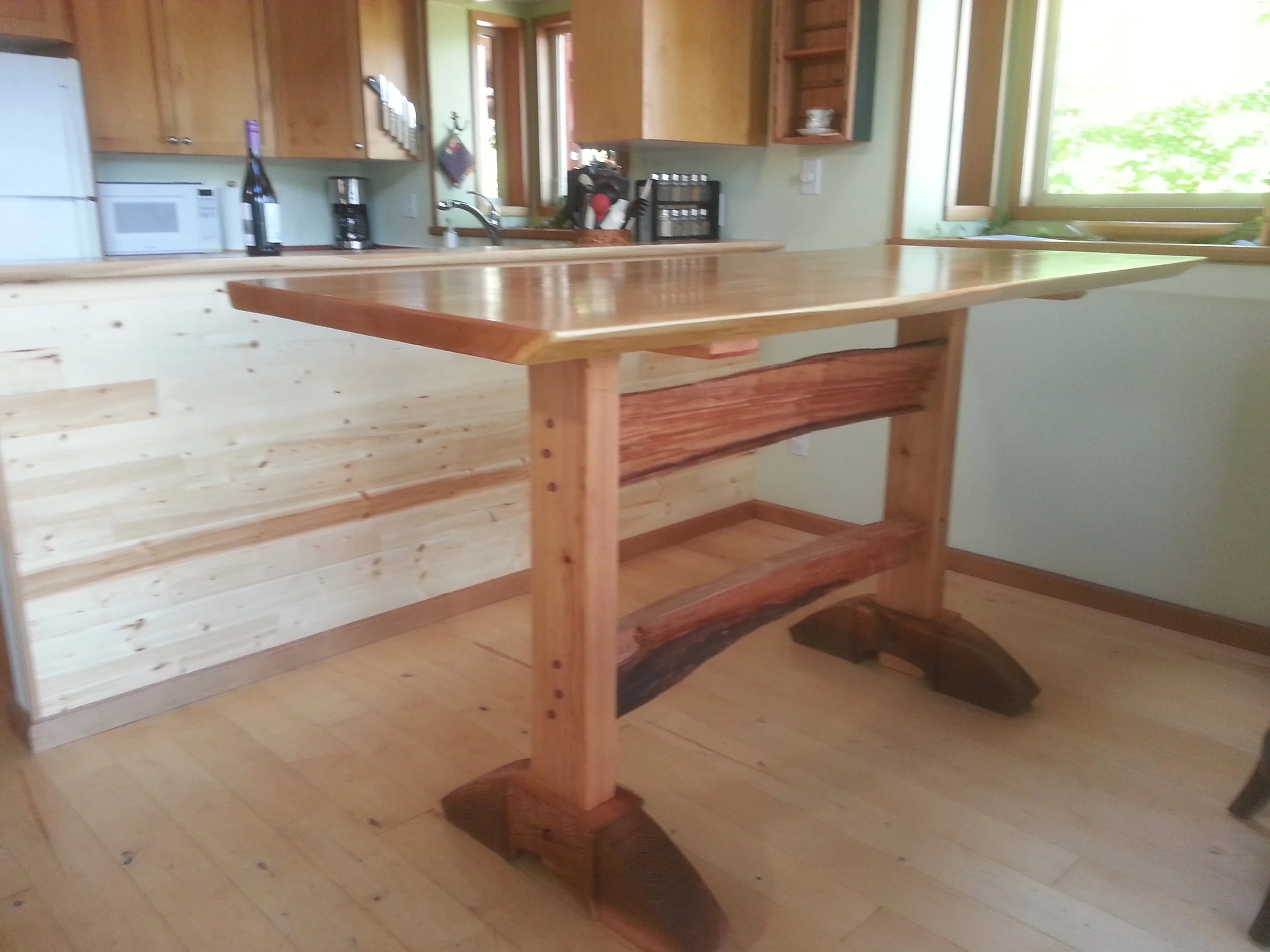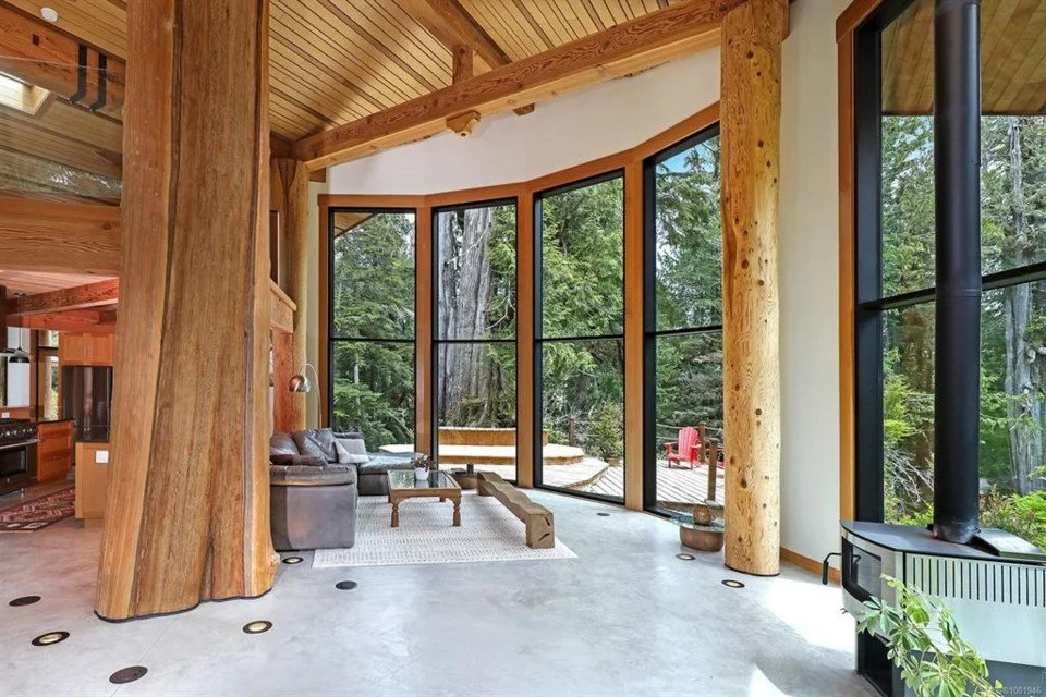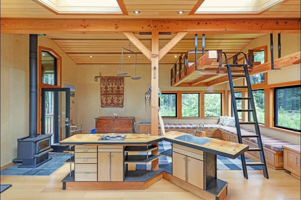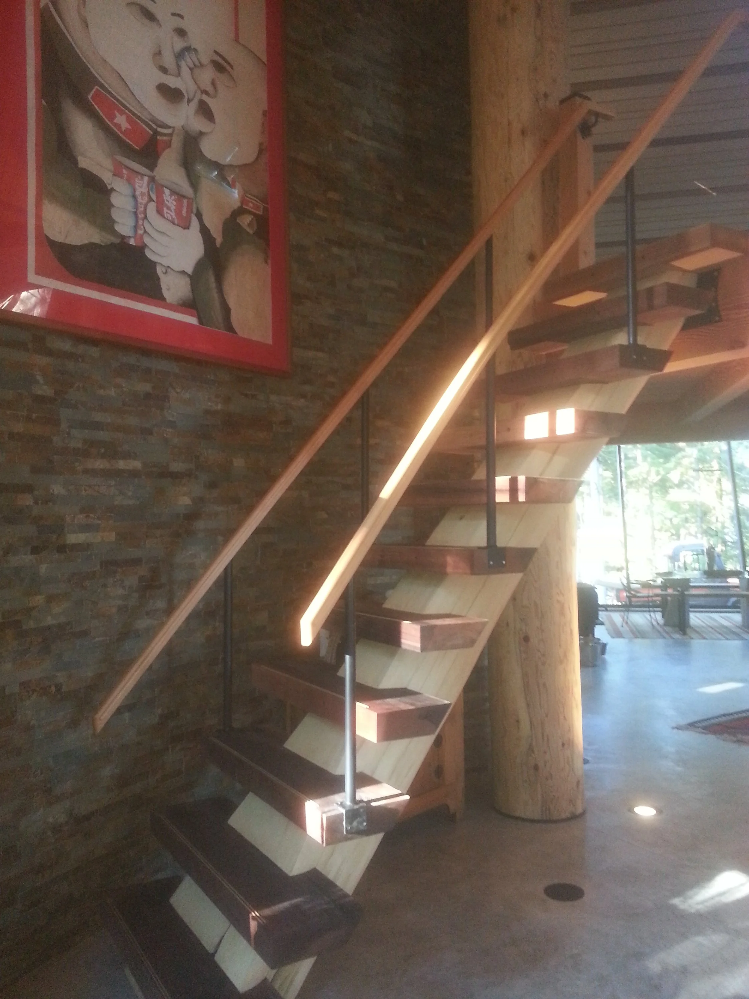 An incredible build with a lot of art-itecture with repurposed building components, yew wood bartop, reclaimed fir floors, Triangle fir slab stairs with floor joists turned into finishing wood.