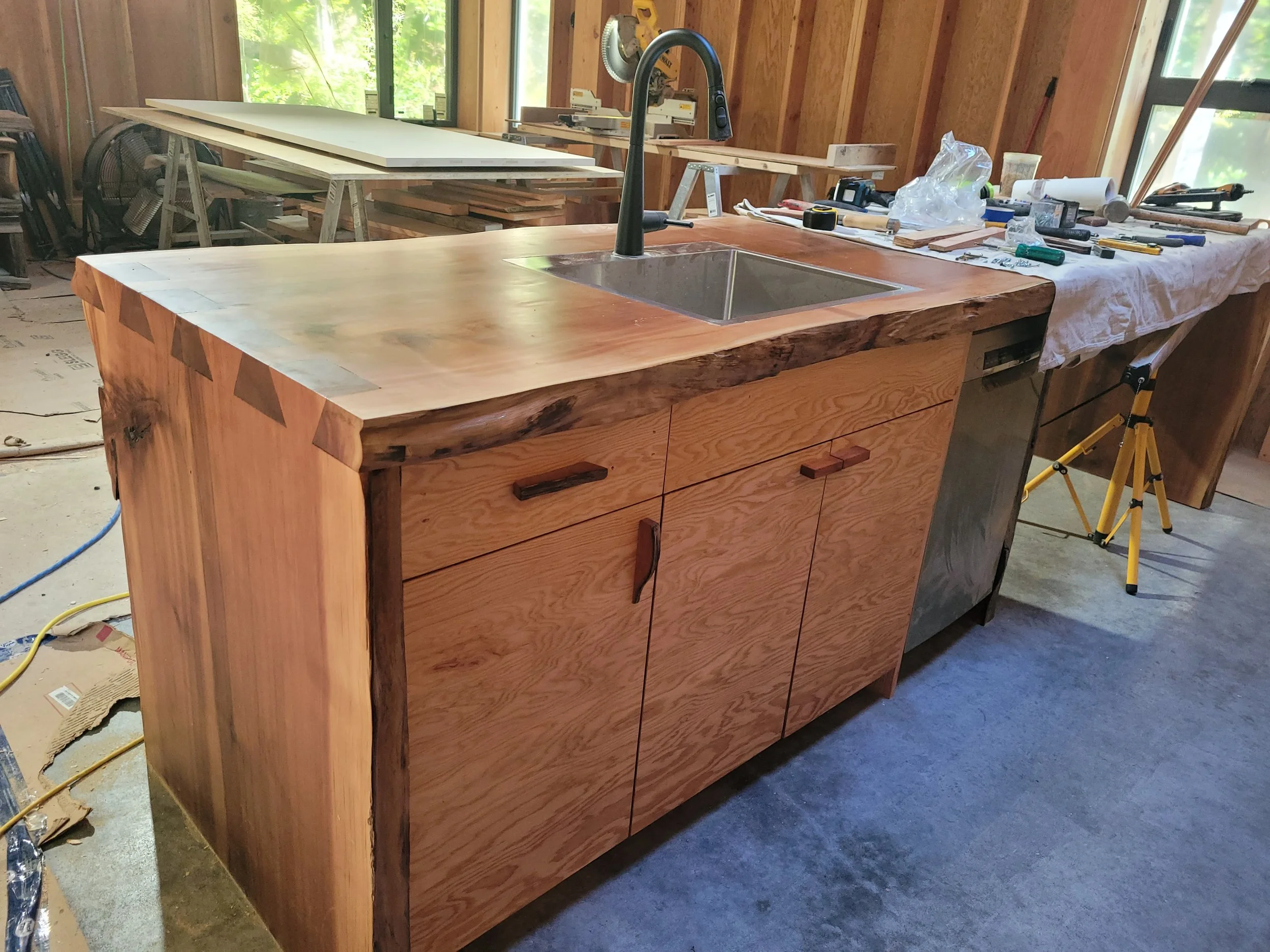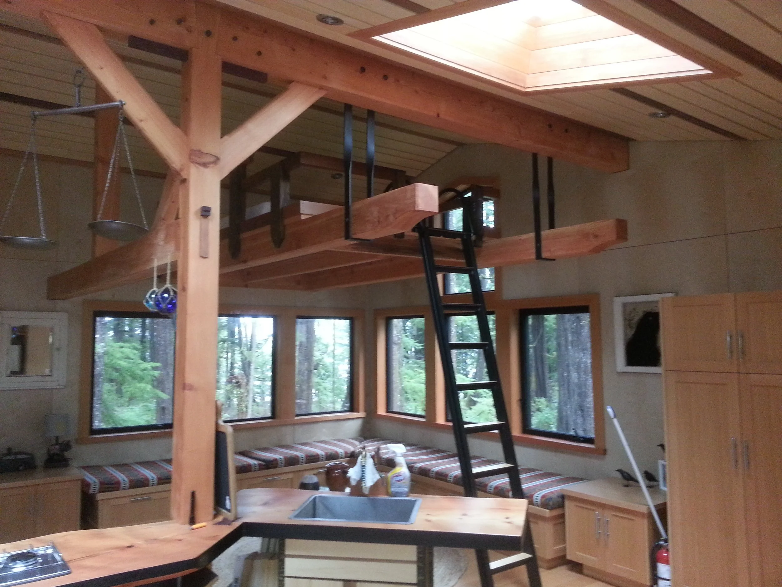 As incredible as the heavy timber portion of the build was, we were lucky to continue with other projects such as a tree-stair system, loft in the cabin and main house, cabin kitchen, furniture, round deck and most recently a timberframe Gazebo.