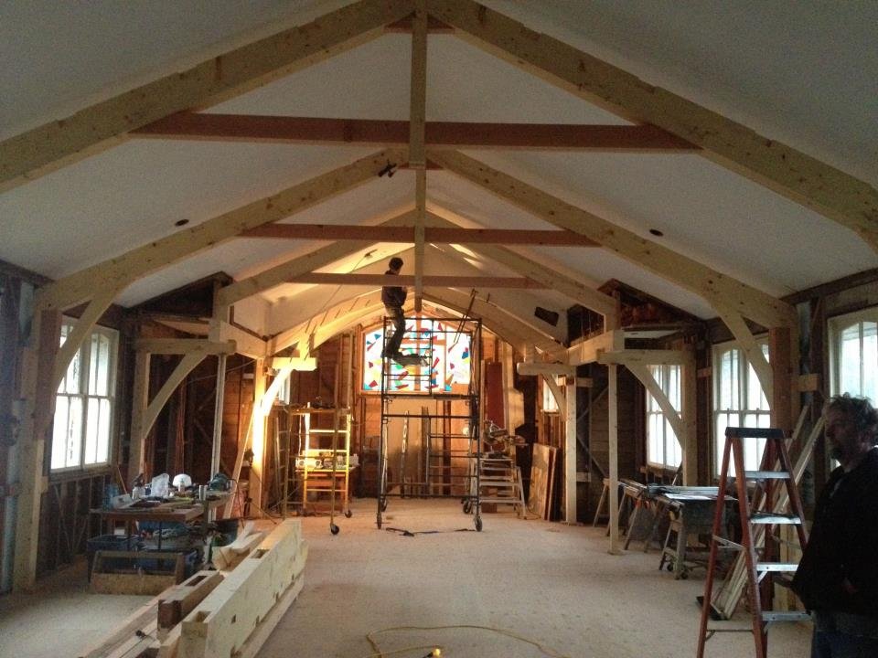 Structural repairs and upgrades to the framing, roof structure, the Bell Tower modification and a “Trimberframe” to church the place up was a challenging, enjoyable time!